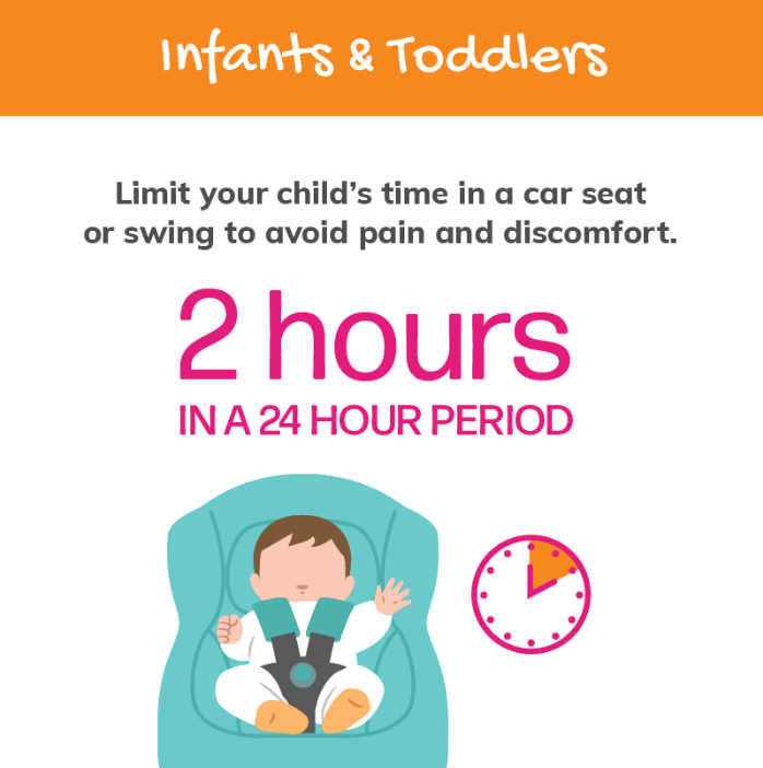 - Limit a child’s time in a car seat or swing to 2 hours per 24-hour period to avoid pain and discomfort.