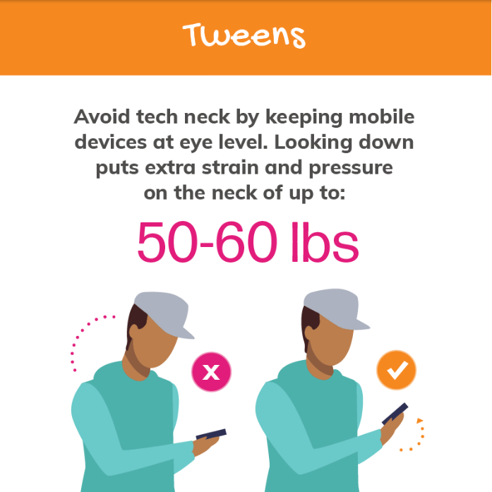 - Encourage children to keep devices at eye level to avoid tech neck, as looking down adds 50-60 lbs of pressure on the neck.