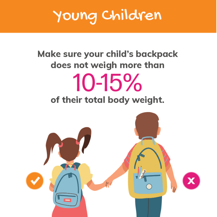 - A child’s backpack should not weigh more than 10-15% of their total body weight.