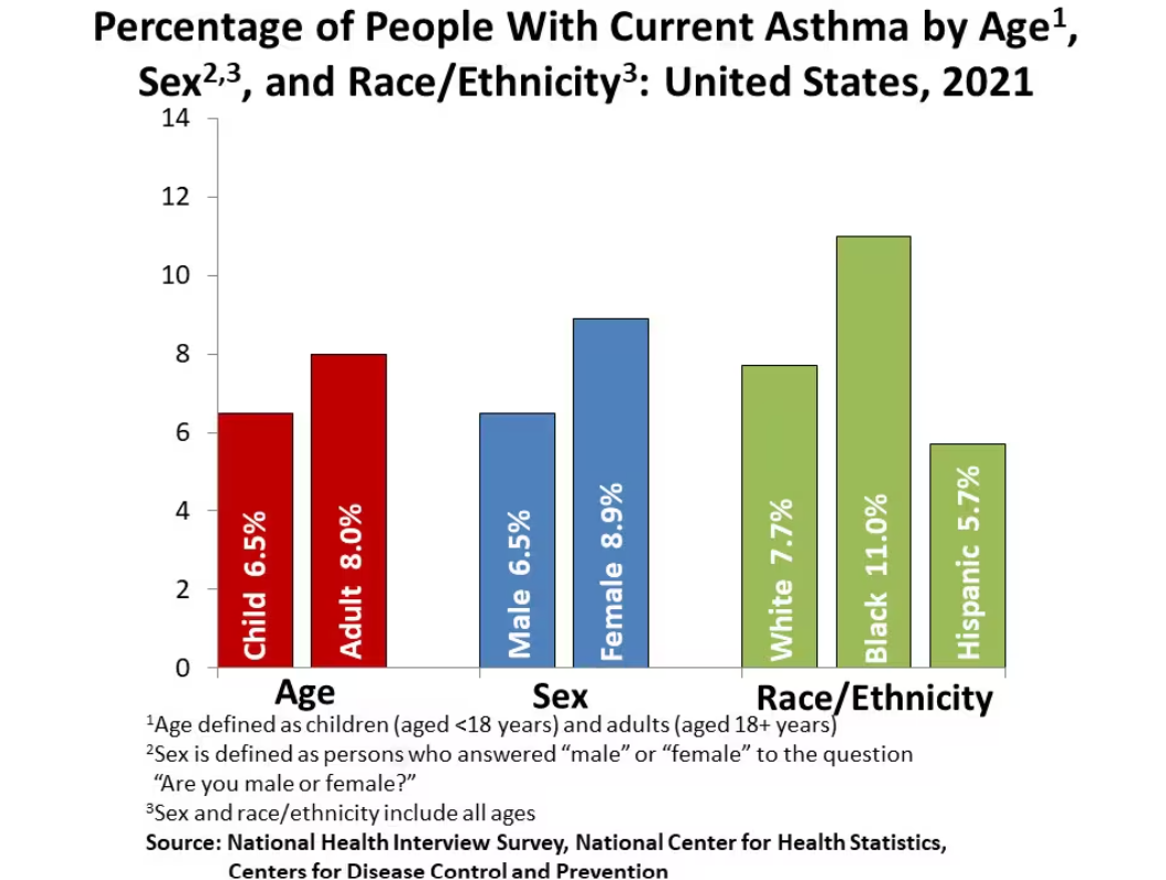 Asthma is a chronic lung disease characterized by inflammation and narrowing of the airways, leading to difficulty breathing. It affects individuals of all ages, with a significant portion being children under 18 years old. According to the CDC, asthma impacts more than 25.9 million Americans, highlighting its widespread prevalence. As illustrated by the following graph from the CDC, we can see the demographics most impacted with asthma.